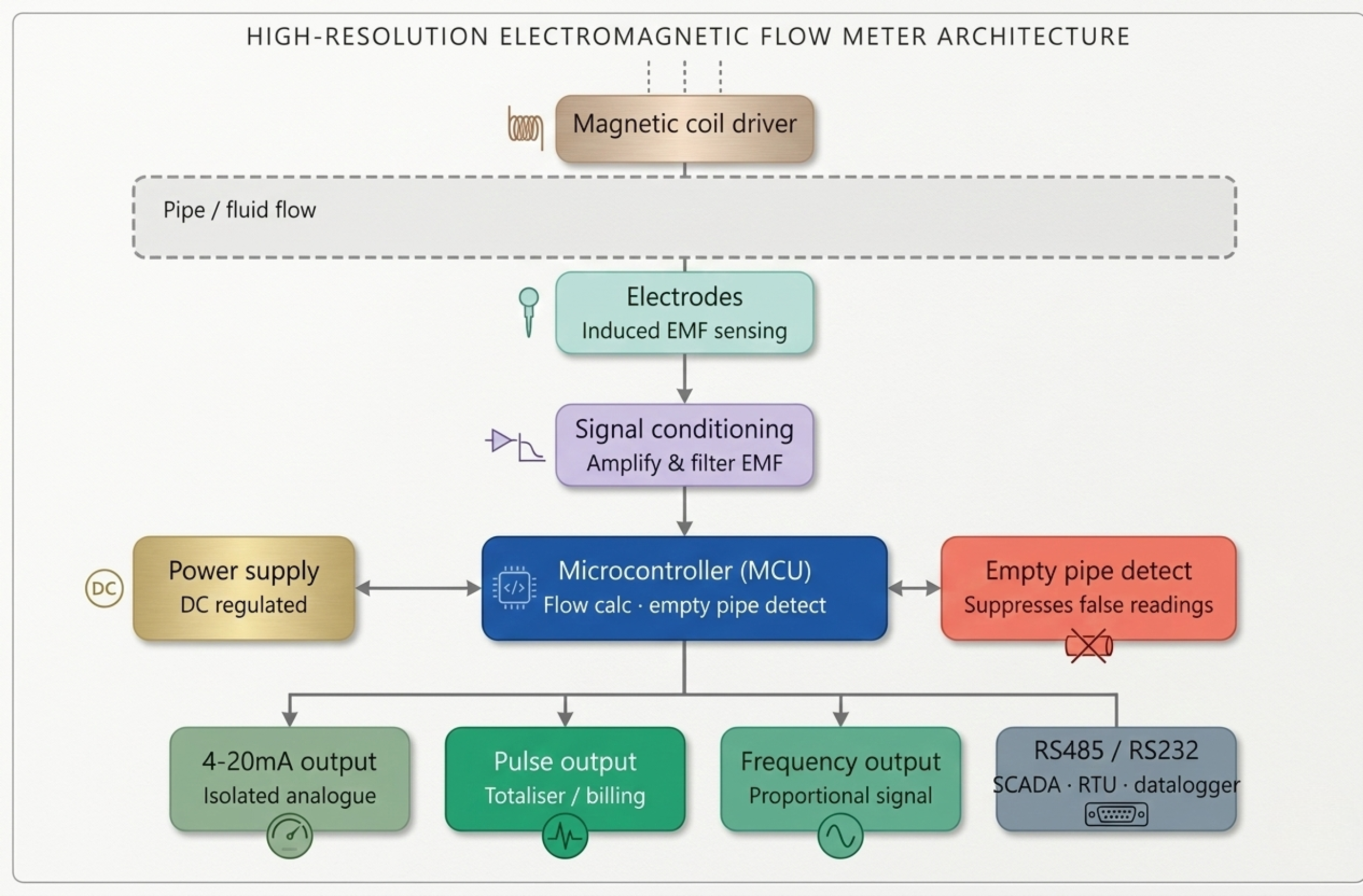 We developed a fully custom Electromagnetic Flow Meter built on an MCU-based architecture, using Faraday’s law of electromagnetic induction to measure liquid flow with no moving parts and no fluid contact on the sensing elements.